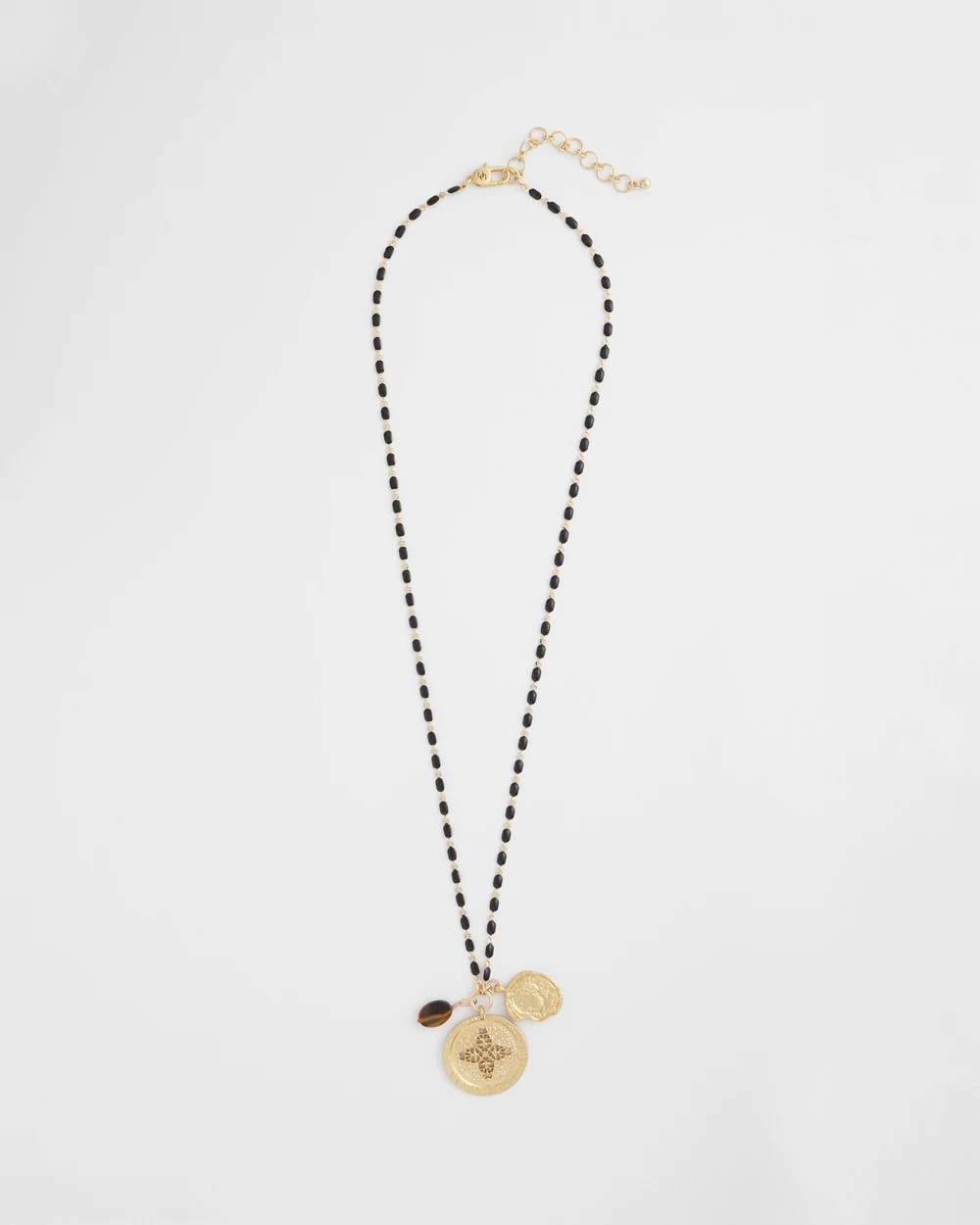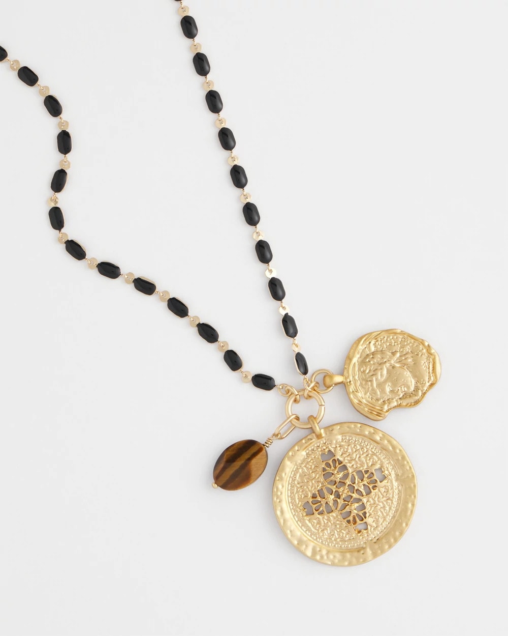 The perfect layering necklace—this sleek Tiger’s Eye Stone Medallion Necklace. Layer with other pieces featuring tiger’s eye stone and gold tones or experience simplicity at its best by wearing on its own.