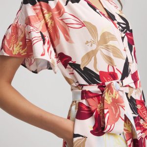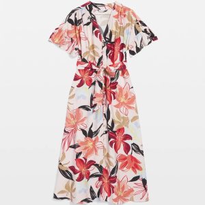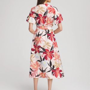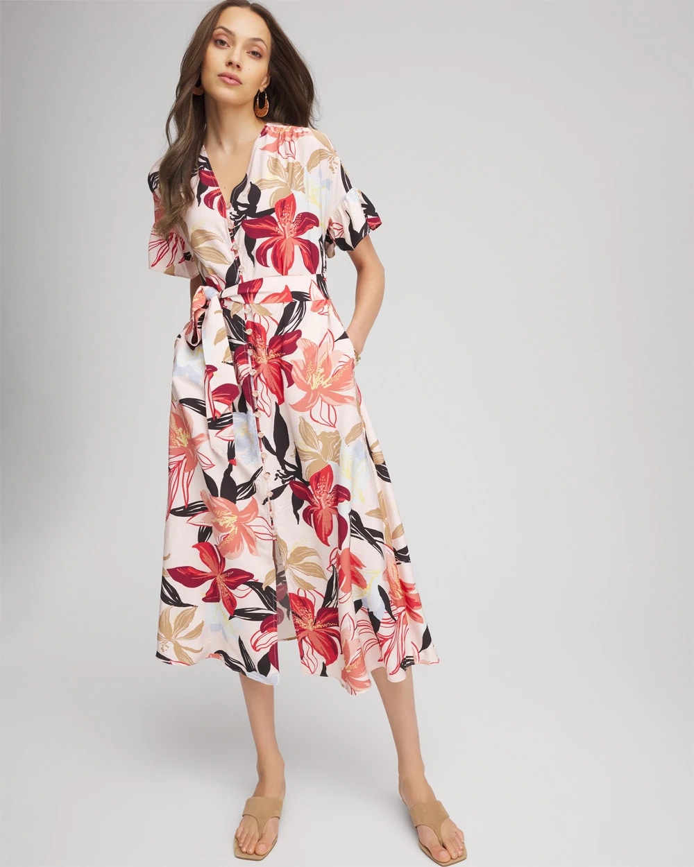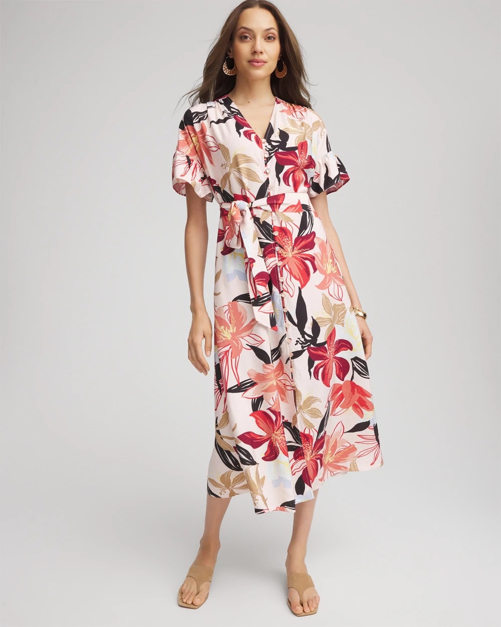 Tonal Floral Ruffle-Sleeved Midi Dress