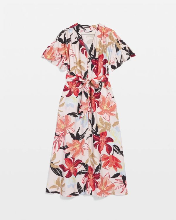 Tonal Floral Ruffle-Sleeved Midi Dress