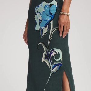 When fashion and art collide—theTravelers™ Artisanal Midi Skirt re-imagines Chico’s signature Naia fabric midi silhouette with an array of thoughtful design elements. Showcasing breathtaking tonal blue floral design outlined in black, set against a rich green backdrop. Cut from breathable, travel-friendly, wrinkle-free, and sustainable Naia fabric. Wear with the custom made to match Travelers™ tunic and jacket or black side-slit tank and cardigan.