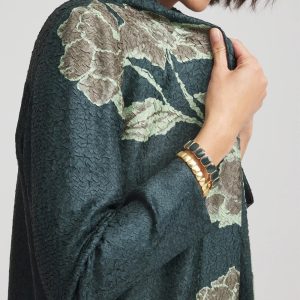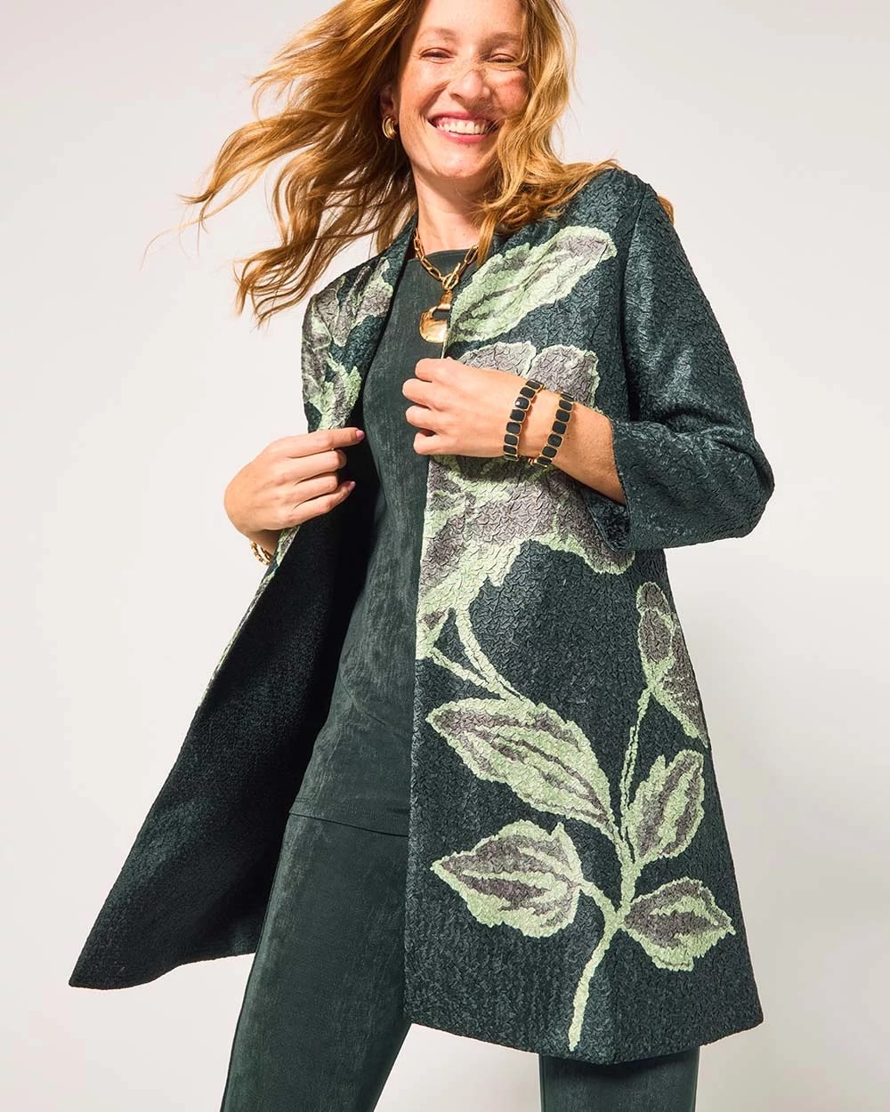 Crushed jacket, inspired by our love of fashion as art—sultry, breezy, and sophisticated. Two ways to wear, solid or print. Bracelet sleeves, open-front reversible jacket with flawless construction. The perfect, lightweight jacket—from daytime stroll to dinner plans—pack this topper without the worry of wrinkling. Custom-colored to match the artisanal tunic and midi skirt.