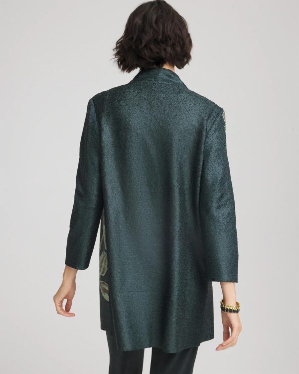 Crushed jacket, inspired by our love of fashion as art—sultry, breezy, and sophisticated. Two ways to wear, solid or print. Bracelet sleeves, open-front reversible jacket with flawless construction. The perfect, lightweight jacket—from daytime stroll to dinner plans—pack this topper without the worry of wrinkling. Custom-colored to match the artisanal tunic and midi skirt.