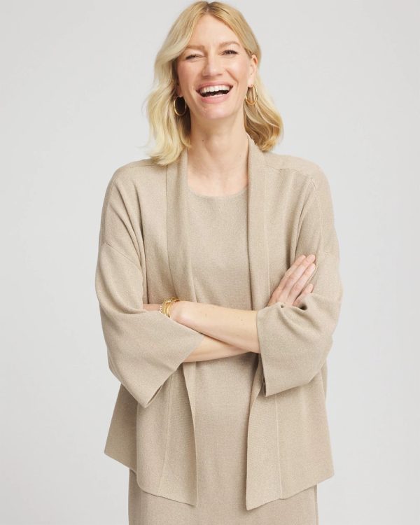 An airy high-shine knit brings instant glamour to this kimono-inspired cardigan. Designed with an array of thoughtful elements, including glistening metallic threads, ribbed placket, and rounded collar. For added luxury, pair this open-front cardigan with its custom-made to match Travelers™ Collection Knit Dress—two styles with endless possibilities for ways to wear.