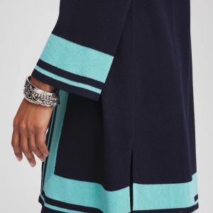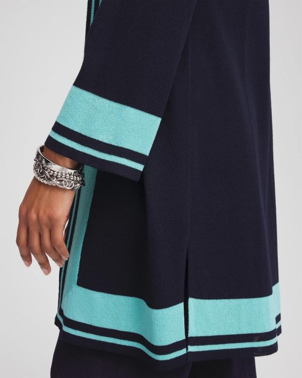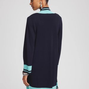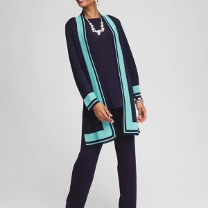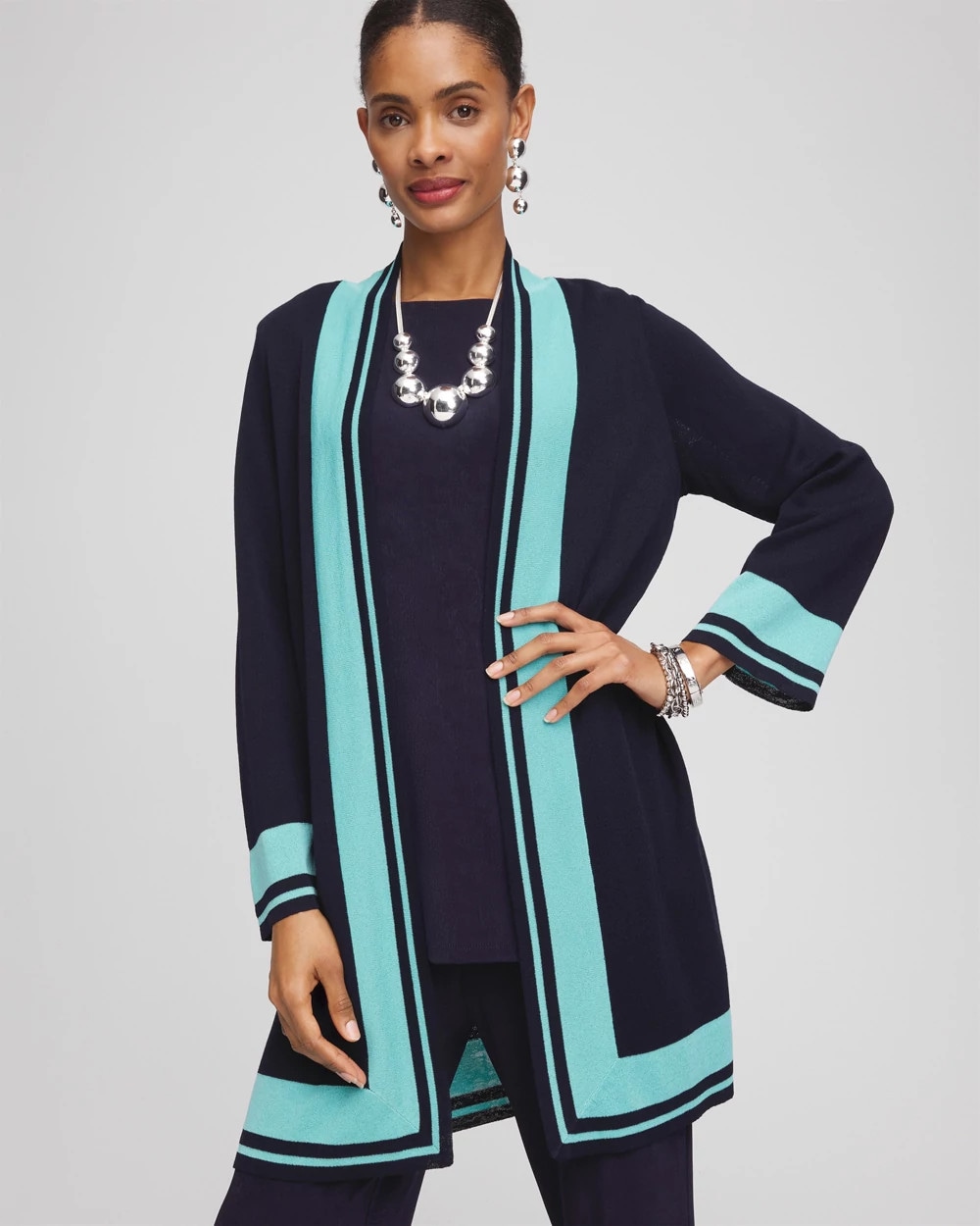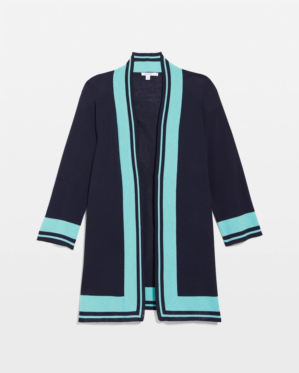 This new Travelers™ Collection Open-Front Cardigan instantly elevates your style. Stunning and glamorous hues with contrast blue bordering. Custom-colored to match our wrinkle-free Travelers™ collection.