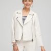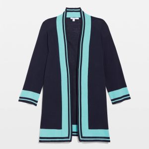 - Classic-fit, open-front cardi with bracelet-length sleeves and contrast blue borders.
