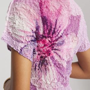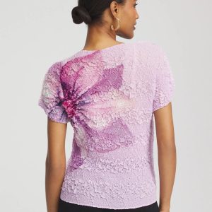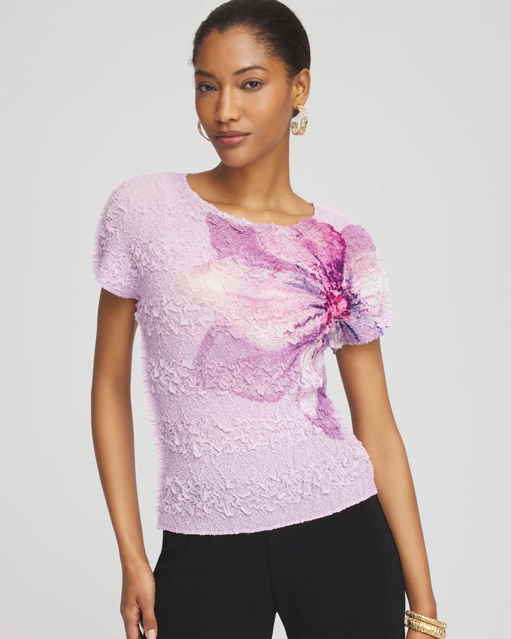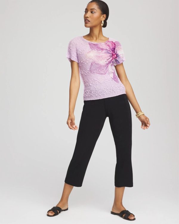 An expertly placed tonal print, against a textured violet aura backdrop, helps define this luxurious and elegant top—showcasing a romantic subtropical hibiscus flower, lending to our heritage. The artisanal print drapes over the left shoulder, extending to the back shoulder blade, drawing the eye and creating a dimensional effect. Pair this jewel-neck,dolman cap-sleeved top with Travelers™ No Tummy Pants or other pieces from the Travelers™ collection.