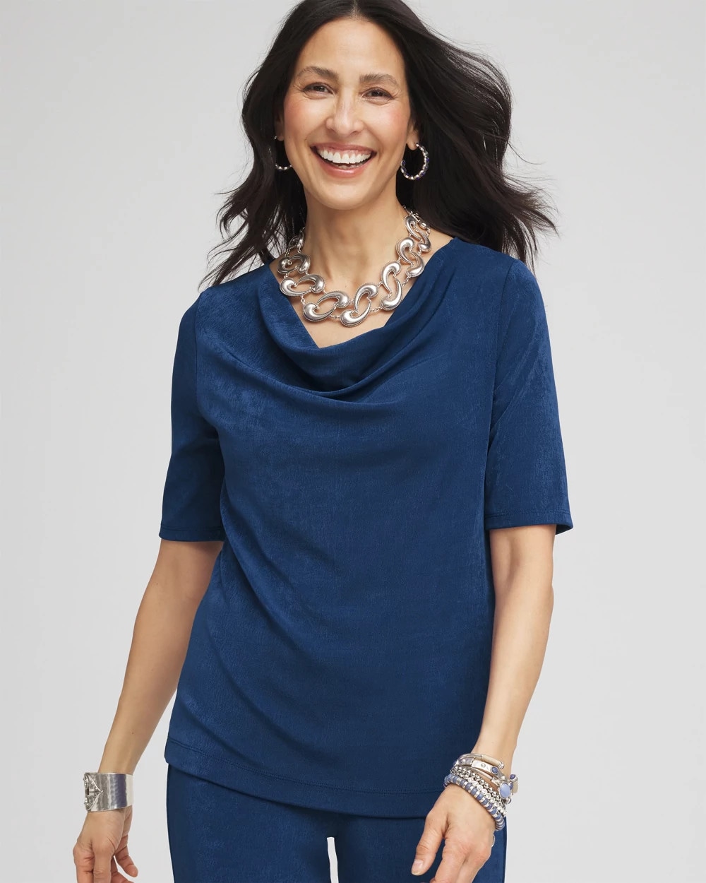 The Travelers™ Cowlneck Top has a classic vacation-ready look and feel. Made with our travel-friendly, wrinkle-resistant, and sustainable fabric, this top features a flattering cowl neckline with a flawless drape. Wear it with our Travelers™ jackets and skirts for a look that stays stylish, no matter how long it stays in your suitcase.