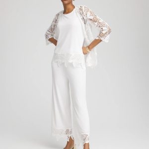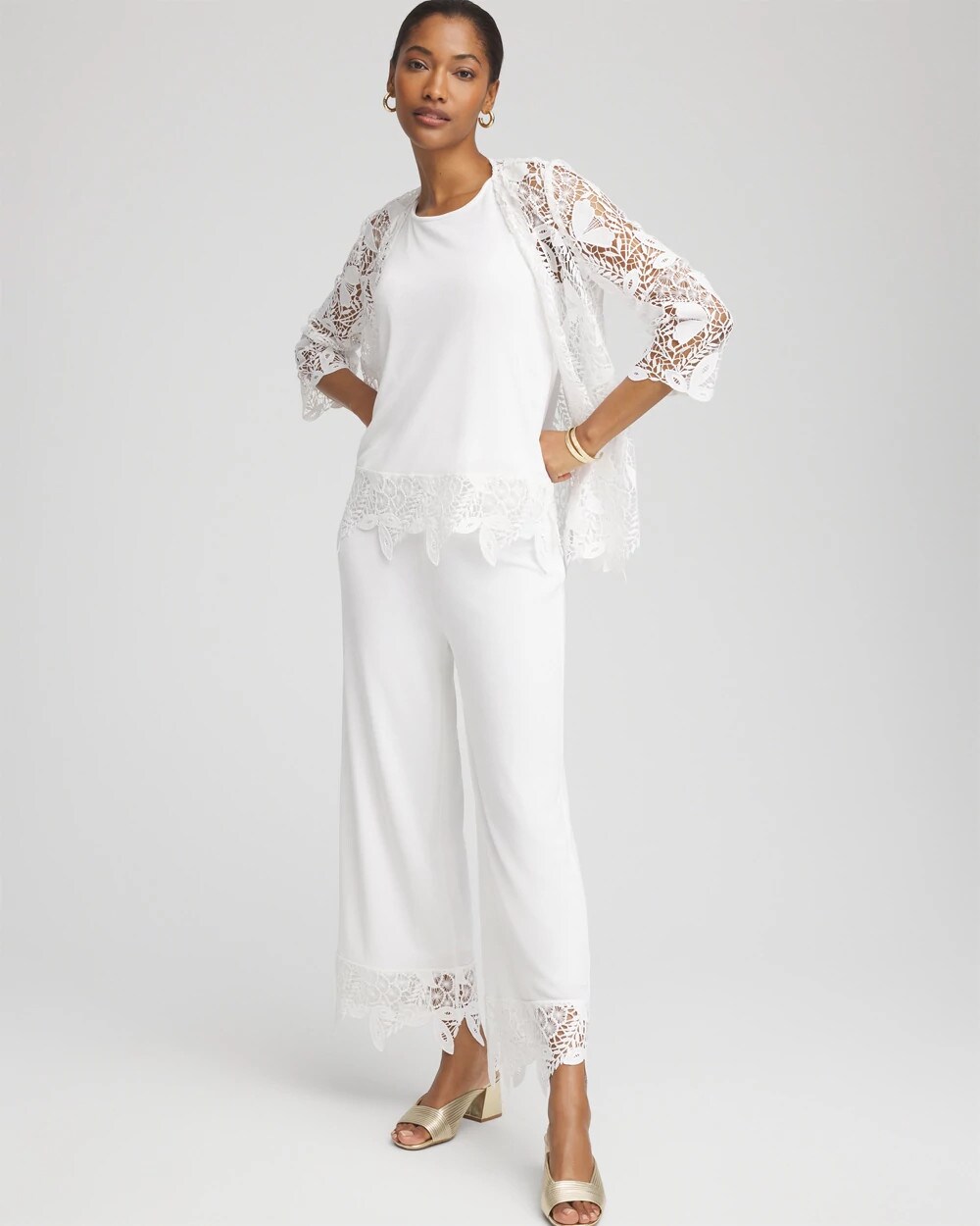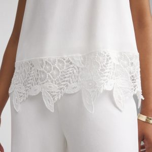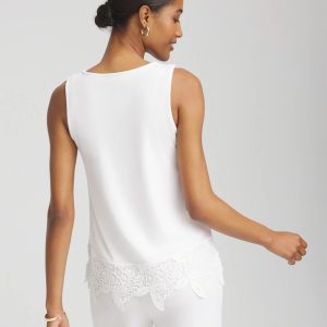 The Travelers™ Lace Trim Tank is a glamorous addition to your summer vacation wear. Perfectly packable style: wrinkle-resistant, sustainable naia fabric. The crochet-lace trim is luxurious and ultra-flattering. Featuring side slits to create ease and comfort. This top is made to match with our new Travelers™ lace crops and jacket.