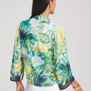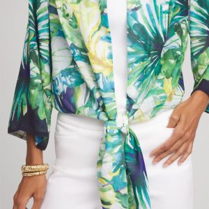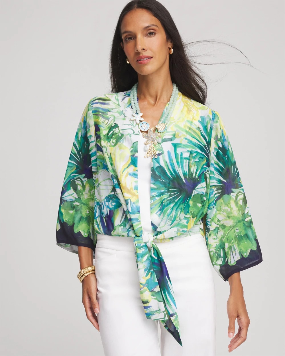 For the brighter, warmer days of the season, our new Tropical Tie-Front Kimono has classic breezy style. Showcasing blue, green, and yellow hues in a palm tree jungle motif. Sleek tie-front closure with bracelet sleeves and fully lined. Pair with its matching outerwear, dress it down with jeggings on casual days, or dress is up with pants for more upscale affairs.