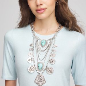 Statement necklace showcasing genuine turquoise stone, antique-style coins, and mixed-media chains. Can be worn to elevate your casual wear or as a finishing touch to your upscale styles. Pair with the matching earrings and other silvertone pieces especially from Chico’s Regional Gems Turquoise Collection.