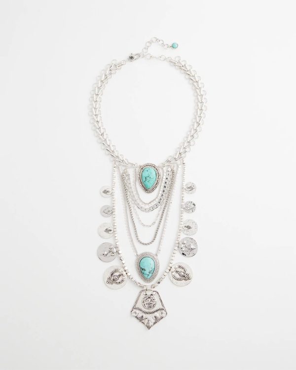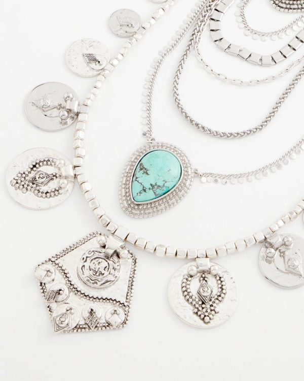 Statement necklace showcasing genuine turquoise stone, antique-style coins, and mixed-media chains. Can be worn to elevate your casual wear or as a finishing touch to your upscale styles. Pair with the matching earrings and other silvertone pieces especially from Chico’s Regional Gems Turquoise Collection.