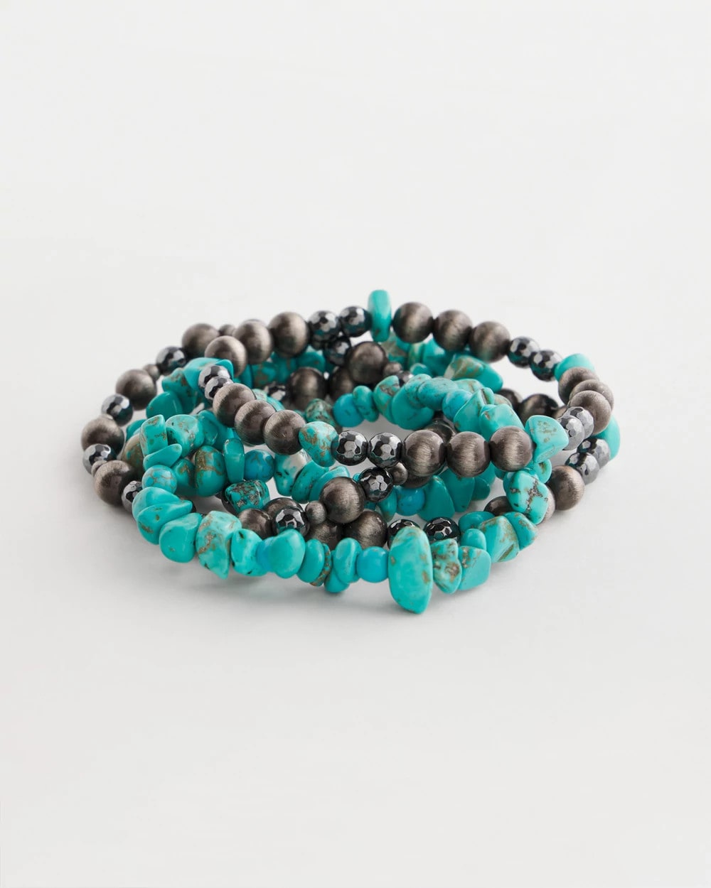 The Stretch Set of Five Beaded Bracelets has your all-in-one style solution. This set includes five stretch bracelets that can be stacked or worn separately. Showcasing genuine turquoise stone and rich metals. Pair with pieces from Chico’s Regional Gems Turquoise Collection.