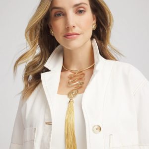 Embodying our Heated Curves Collection, showcasing twisted metal, a sleek golden sun charm, flowing tassel—all convening on aflexible collar. Pair with matching earrings and bracelet.