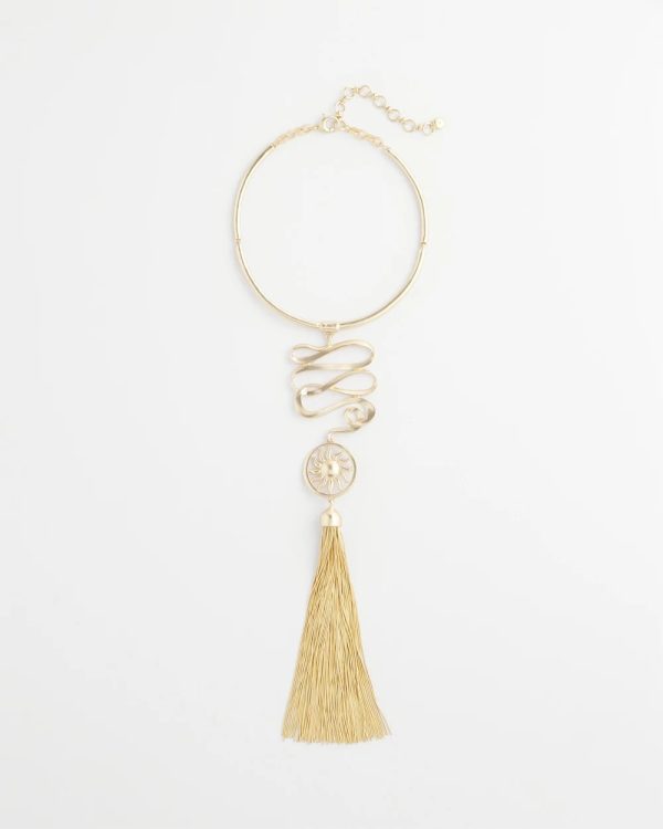 Embodying our Heated Curves Collection, showcasing twisted metal, a sleek golden sun charm, flowing tassel—all convening on aflexible collar. Pair with matching earrings and bracelet.