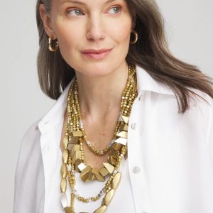 Cascading layers of multi-shaped wood beads and a brass base unite, forming into a statement bib necklace that keeps nature in mind. Multi-strand with tonal metallic hues in gold and silver. The perfect necklace for your scoop or v-neckline tops and dresses to embody the spirit of the season.