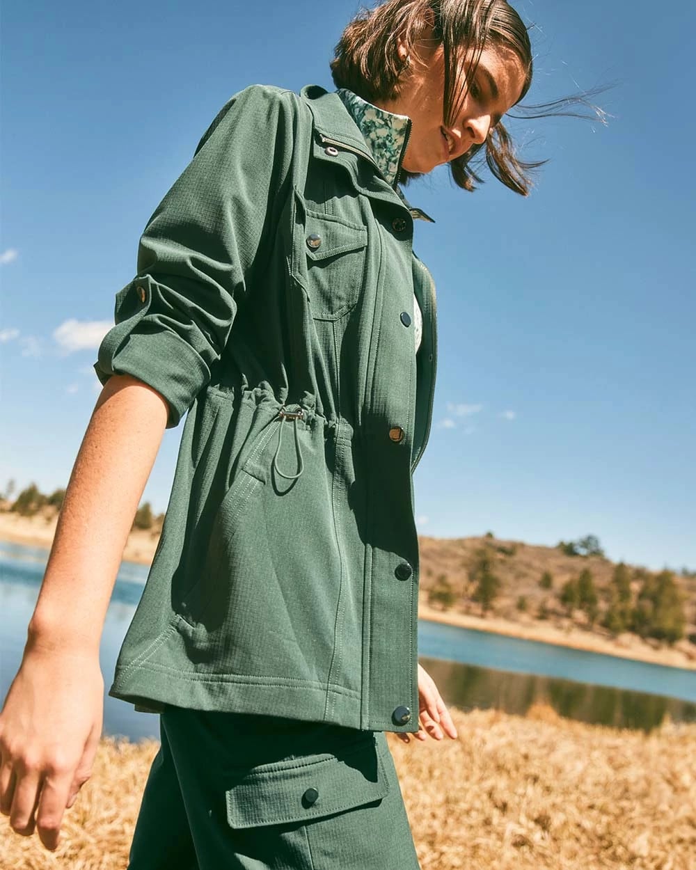 Crafted for performance with a sporty sensibility, this Ripstop Cargo Jacket is cut from specialized fabric that prevents wear and tears, adding durability and abrasion resistance. Features built-in quick-dry and sweat-wicking capabilities, plus UPF 50+ to block both UVA and UVB rays.Showcasing front snap placket, mesh interior pockets, roll-tab sleeves, and bungee cinche waist.