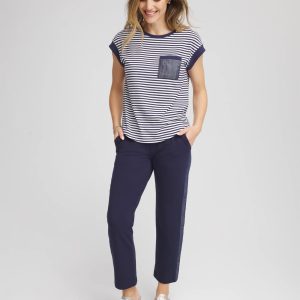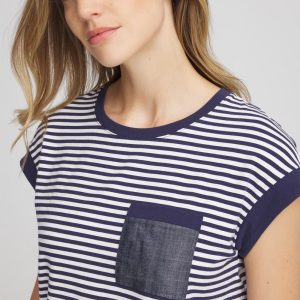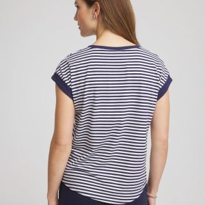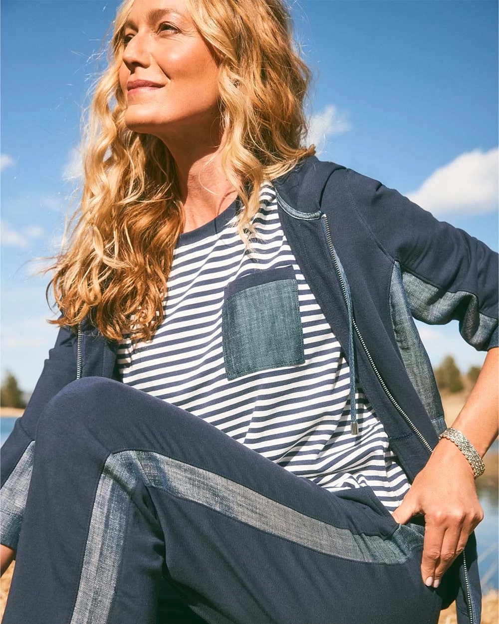 The perfect tee for your active state of mind. Cut from lightweight UPF knit rated UPF 50+ to block both UVA and UVB rays. This year-round staple showcases the super-soft and comforting fabrication you know and love of Zenergy® styles—elevated with a linen-chambray accent pocket for a denim feel. Featuring timeless pinstripes and rolled cuffs. Made to be paired with its matching jacket and cropped pants or other Zenergy® pants, jackets, and outerwear.